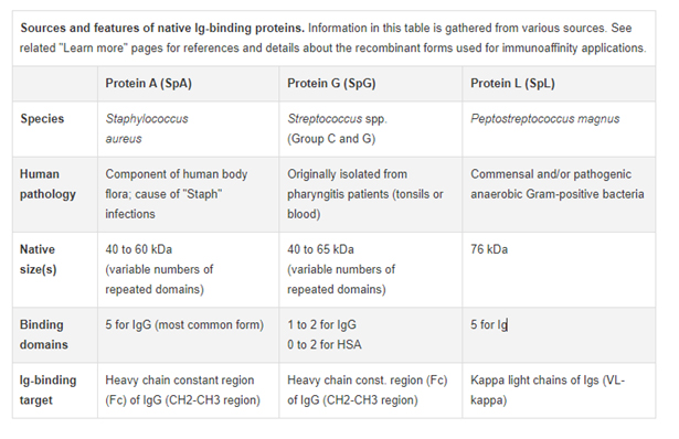 پروتئینهای A، G و L سه پروتئین باکتریایی هستند که خواص اتصال آنتی بادی آنها به خوبی مشخص شده است. این پروتئین ها به صورت نوترکیب تولید شده اند و به طور معمول برای خالص سازی میل ترکیبی انواع آنتی بادی های کلیدی از گونه های مختلف استفاده می شوند. بیشتر اشکال نوترکیب این پروتئینها که به صورت تجاری در دسترس هستند، توالیهای غیرضروری آنها حذف شدهاند از جمله دامنه اتصال HSA از پروتئین G بنابراین کوچکتر از همتایان بومی خود هستند. یک شکل نوترکیب دستکاری شده ژنتیکی از پروتئین A و پروتئین G به نام پروتئین A/G نیز به طور گسترده در دسترس است. هر چهار پروتئین نوترکیب متصل شونده به Ig به طور معمول توسط محققان در بسیاری از کاربردهای تشخیصی و ایمنی استفاده می شوند.